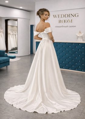 Свадебное платье с открытыми плечами и драпированным корсетом Элегантное свадебное платье с открытыми плечами — идеальный выбор для невесты, которая хочет выглядеть современно и изысканно. Модель выполнена в актуальном минималистичном стиле и подчёркивает естественную красоту фигуры. Драпированный корсет мягко моделирует силуэт, подчёркивая линию талии и создавая красивую посадку. Линия декольте с открытыми плечами делает образ нежным и романтичным, а гладкая струящаяся ткань придаёт платью благородную элегантность. Длинная юбка свободно ниспадает вниз и образует изящный шлейф. Высокий разрез на юбке добавляет лёгкости и современного характера, позволяя подчеркнуть стройность ног и сделать образ более динамичным. Спинка украшена аккуратной шнуровкой, которая обеспечивает идеальную посадку по фигуре и создаёт утончённый свадебный силуэт. Это современное свадебное платье в стиле минимализм прекрасно подойдёт для: классической свадьбы современной городской свадьбы церемонии в европейском стиле свадебной фотосессии ✨ Примерить это свадебное платье с открытыми плечами можно в салоне WEDDING ROOM. В салоне представлен большой выбор современных свадебных платьев, кружевных моделей и платьев в стиле минимализм. Запишитесь на примерку и найдите платье, в котором вы будете чувствовать себя по-настоящему особенной.