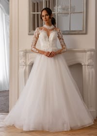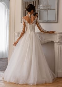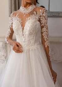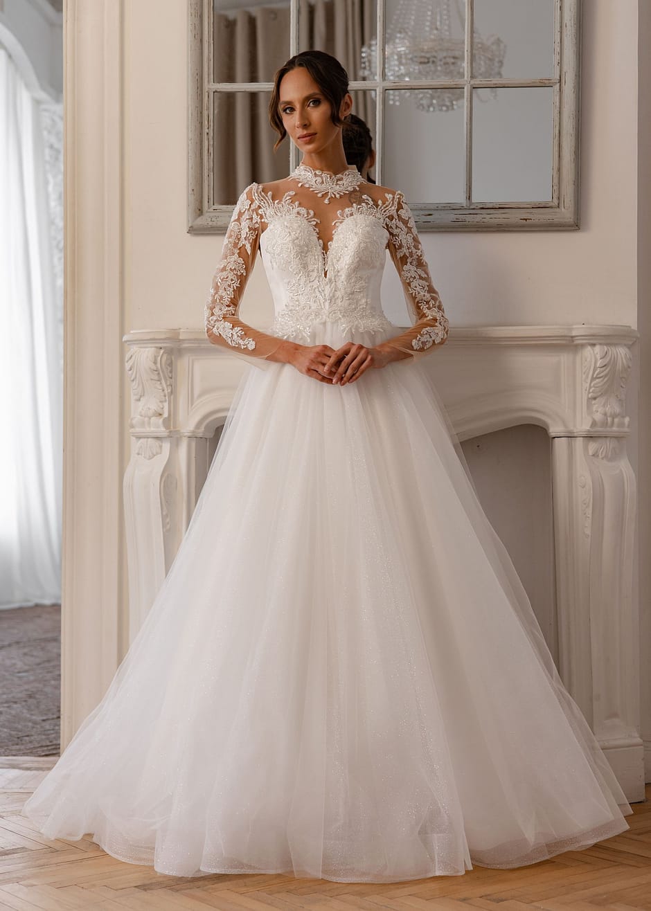 Стильное закрытое свадебное платье, пышная юбка, длинный кружевной рукав. Очень красивая спинка на пуговицах, корсет регулируется шнуровкой. Подойдет для церемонии венчания. Артикул 10080