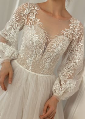 Женственное свадебное платье с умеренно пышной мерцающей юбкой, вырез сердечком, красивое кружево пышный рукав на манжете, шнуровка, регулируемые корсет, тонкий поясок на линии талии. Артикул 10023