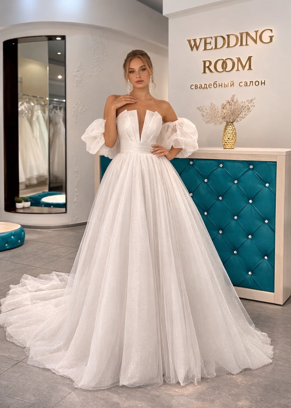 Свадебное платье «Капелла Блеск» — эффектная модель для невесты, которая хочет выглядеть по-настоящему роскошно и современно. Платье сочетает классический силуэт принцессы и трендовую фактуру ткани с деликатным мерцанием. Корсет с открытыми плечами выполнен с выразительной драпировкой и глубоким декольте, которое визуально вытягивает силуэт и подчёркивает линию шеи и ключиц. Объёмные воздушные рукава добавляют образу лёгкость и романтичность. Пышная юбка из многослойного фатина с глиттерным блеском мягко переливается при движении, создавая эффект сияния. Длинный шлейф красиво раскрывается на полу и делает образ особенно торжественным. Сзади платье имеет аккуратную корсетную шнуровку, благодаря которой модель идеально садится по фигуре. Платье «Капелла Блеск» идеально подойдёт для: — классической свадьбы — роскошной фотосессии — торжественной церемонии — невесты, которая хочет эффектный и запоминающийся образ. Эта модель выглядит дорого, воздушно и очень фотогенично — именно поэтому она так красиво смотрится на свадебных фотографиях. Примерить платье можно в свадебном салоне WEDDING ROOM.