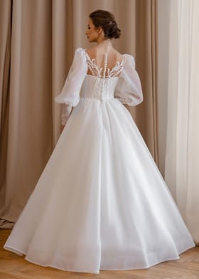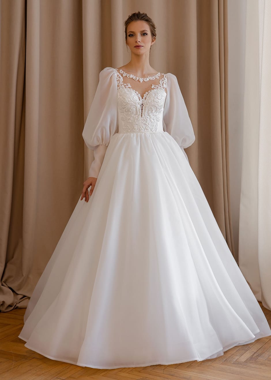 свадебное платье из восковой органзы, классика в современном исполнении, пышный рукав, расшитые манжеты, красивая закрытая спинка на пуговицах, имитация колье. Артикул 10523