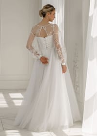 Легкое свадебное платье с нежным корсетом, красивая изящная спинка, пышные рукава, корсетная шнуровка . Тонкий поясок из жемчуга, стекляруса, бисера. Артикул 10081