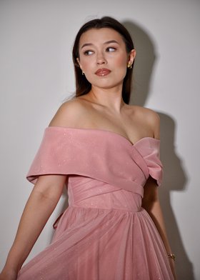 Это элегантное длинное вечернее платье нежно-розового цвета с открытыми плечами. Модель отличается изысканным кроем: верх выполнен с драпировкой, создающей эффектный объём на плечах и груди, а юбка — струящаяся, в пол, из лёгкой полупрозрачной ткани с лёгким блеском. Фасон подчёркивает женственность и утончённость, идеально подходит для торжественных мероприятий: выпускных вечеров, свадеб, коктейльных вечеринок и светских раутов.