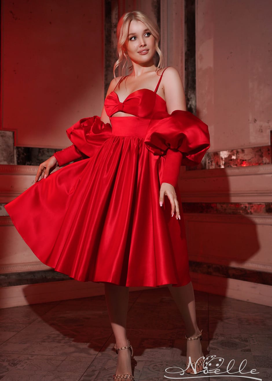 Красное атласное платье в длине миди на выпускной