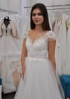 Эффект спущенного плечика, вырез сердечком, корсет украшен бисером золотистого оттенка. Лиф декорирован кружевом с винтажным узором. Артикул 10015