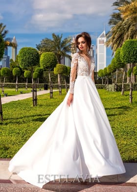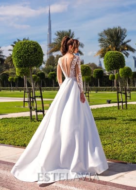 Свадебное платье с кружевным верхом с рукавами и атласной юбкой со шлейфом