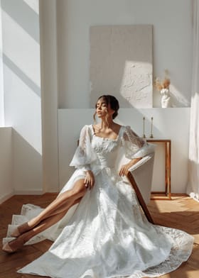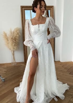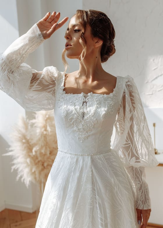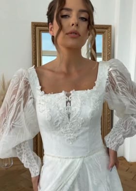 Современное свадебное платье с разрезом запахом. Дорогая глиттерная ткань, корсет декорирован кружевом, Объемные рукава с красивыми манжетами. Артикул 10002