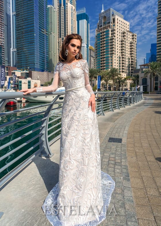 Силуэтное прямое платье из фактурного кружева со шлейфом