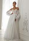 Свадебное платье с рукавами-буфами, нежная мерцающая юбочка, бельевой корсет, корсетная шнуровка, тонкие бретели, лиф украшен стразами и стеклярусом. Артикул 10073