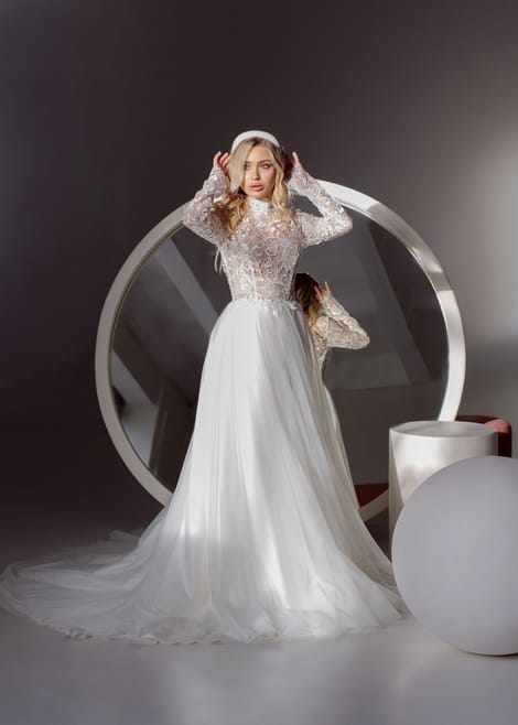 Закрытое свадебное платье с рукавом и воротником-стойка