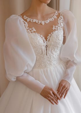 свадебное платье из восковой органзы, классика в современном исполнении, пышный рукав, расшитые манжеты, красивая закрытая спинка на пуговицах, имитация колье. Артикул 10523