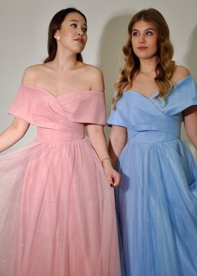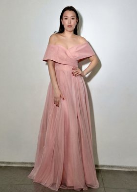 Это элегантное длинное вечернее платье нежно-розового цвета с открытыми плечами. Модель отличается изысканным кроем: верх выполнен с драпировкой, создающей эффектный объём на плечах и груди, а юбка — струящаяся, в пол, из лёгкой полупрозрачной ткани с лёгким блеском. Фасон подчёркивает женственность и утончённость, идеально подходит для торжественных мероприятий: выпускных вечеров, свадеб, коктейльных вечеринок и светских раутов.