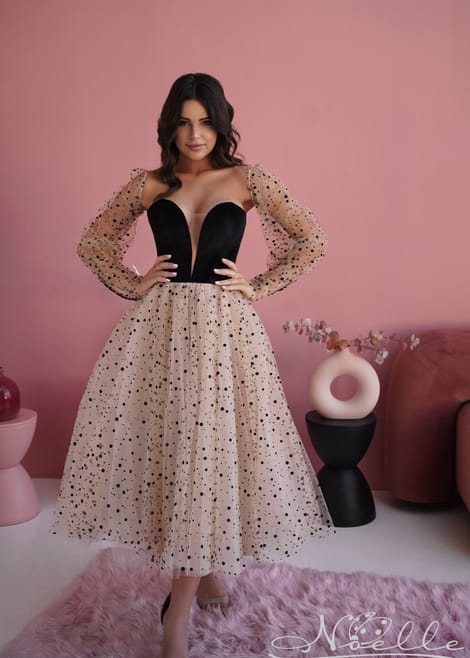 Комбинированное платье из черного бархатного корсета и пышной фатиновой юбочки нежного пудрового оттенка в горошек. Съемные рукава, корсет на шнуровке. Артикул 2142