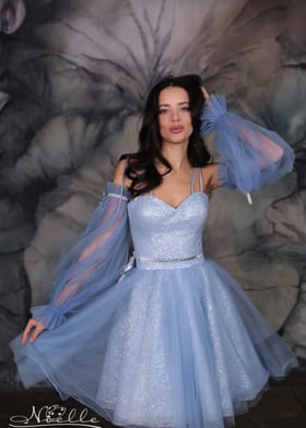 Нежное платье с пышной блестящей юбочкой, стильный фасон рукава, удобный корсет на шнуровке. Разные цвета. Артикул 2163