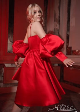 Красное атласное платье в длине миди на выпускной